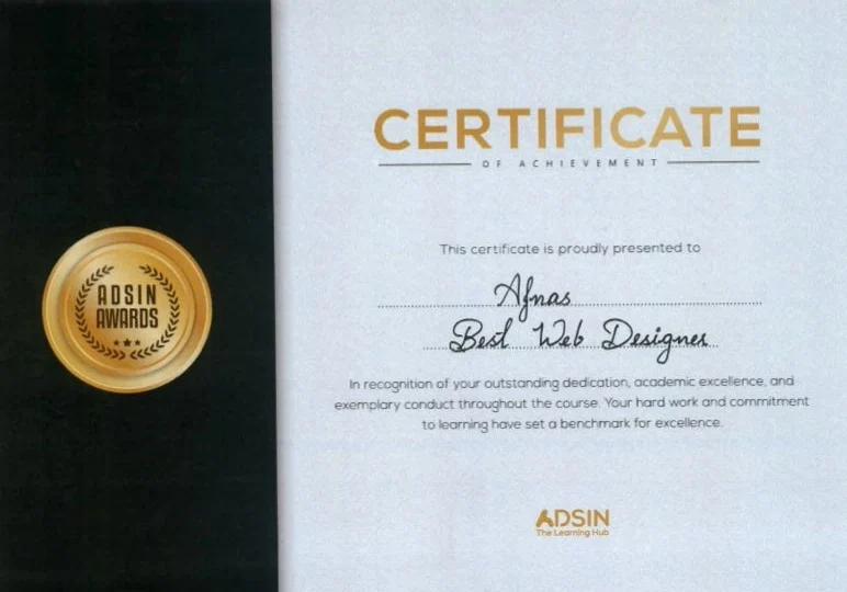 I have been awarded the “Best WordPress Website Designer” certificate by Adsin The Learning Hub in recognition of my skills in designing high quality, responsive, and user friendly WordPress websites. This certification reflects my ability to create visually appealing layouts, optimize performance, and deliver websites that meet modern design and business standards. As the Best Digital Marketing Strategist in Calicut, I combine strong design expertise with strategic marketing knowledge to build websites that not only look great but also drive real business growth.